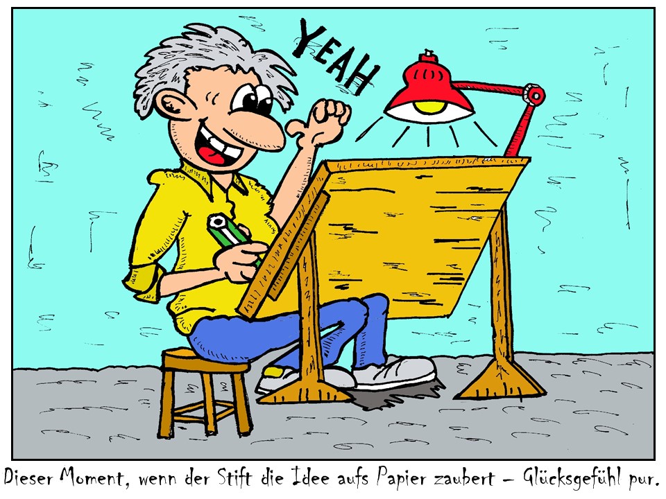 Da sehe ich etwas, worauf Bene schon mal hingewiesen hat: Das Zeidhenbrett steht so, wie Du die Beine gezeichnet hast, eigentlich weit hinter dem Hocker. Das müßte man eigentlich mit Lineal oder Geodreieck ein bißchen konstruieren.