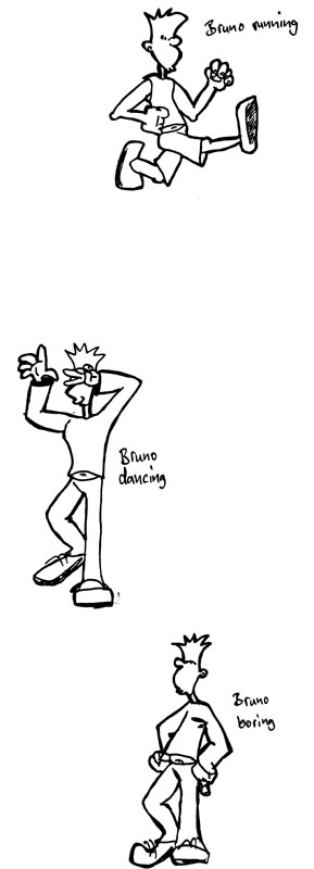Nur die Bewegung bei "Bruno running" find ich nicht ganz eindeutig. Sieht aus, als ob der linke Fuß Bodenkontakt hätte. Und das lässt sich dann vom Betrachter nicht unbedingt als "running" identifizieren. Sieht für mich eher aus, als ob er irgendwo dagegen kickt.