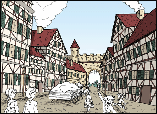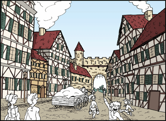 Tolles Ergebis. Auf die Perspektive des Brunnens wurdest du ja schon hingewiesen. Außerdem stimmt der Turm im Hintergrund nicht ganz. So wie du die Ellipse des Daches gezeichnet hast, befindet sich der Betrachter leicht oberhalb davon, allerdings zeigen deine anderen Häuser eindeutig dass dich die Augenhöhe unterhalb des Turmdaches befindet. Der Bogen müsste also nach oben gewölbt sein. Kritzelei dazu im Anhang.