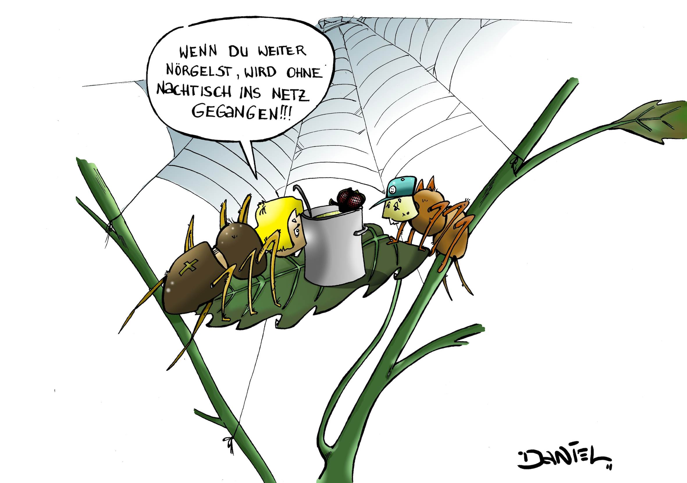 Aber den mittleren Cartoon mit den Spinnen habe ich nicht ganz verstanden. Gibt's denn da etwas Bestimmtes zu essen (und was)? Oder wird nur eine menschliche Situation aufs Tierreich übertragen?