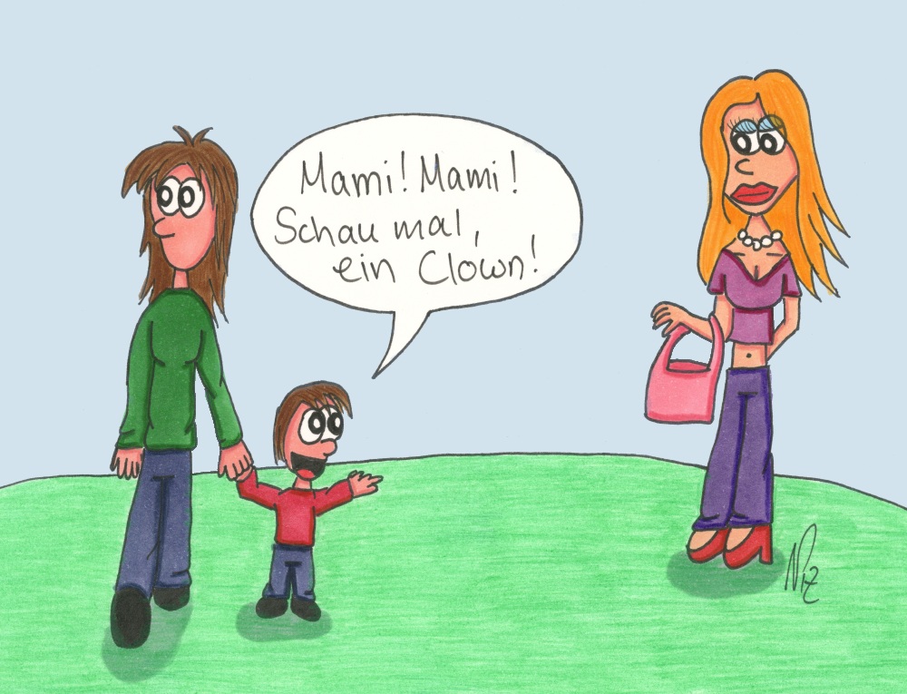 Ich finde den Gesichtsausdruck von dem "Clown" sehr schön! Augen und Mund drücken eine gewisse Dämlichkeit aus, aber sehr sympathisch. Das paßt sehr gut zu Funnyfiguren und zu Cartoons. Aber - unglücklicherweise ist das nicht der optimale Gesichtsausdruck in dieser Situation. Da müßte doch die Frau irgendwie wütend sein auf den kleinen Jungen und seine wenig charmante Bemerkung. Da müßten vielleicht Blitze aus ihren Augen auf ihn schießen oder sowas.