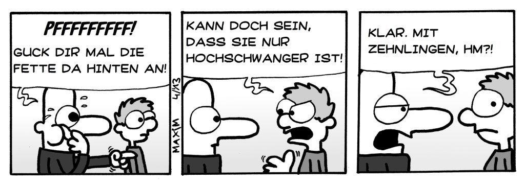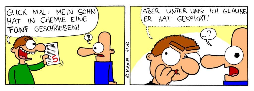 Gesichtsausdrücke hast du mal wieder super hingekriegt! Ja, der vorletzte Strip ist echt verwirrend :D Zum vorvorletzen Strip: Ich find schon das der Humor passt, ich fands ganz lustig :) Den letzen versteh ich nicht so ganz, ist der Sohn so schlecht, das er ohne spicken eine 6 bekommen hätte, oder ist er so schlecht weil er gespickt hat?