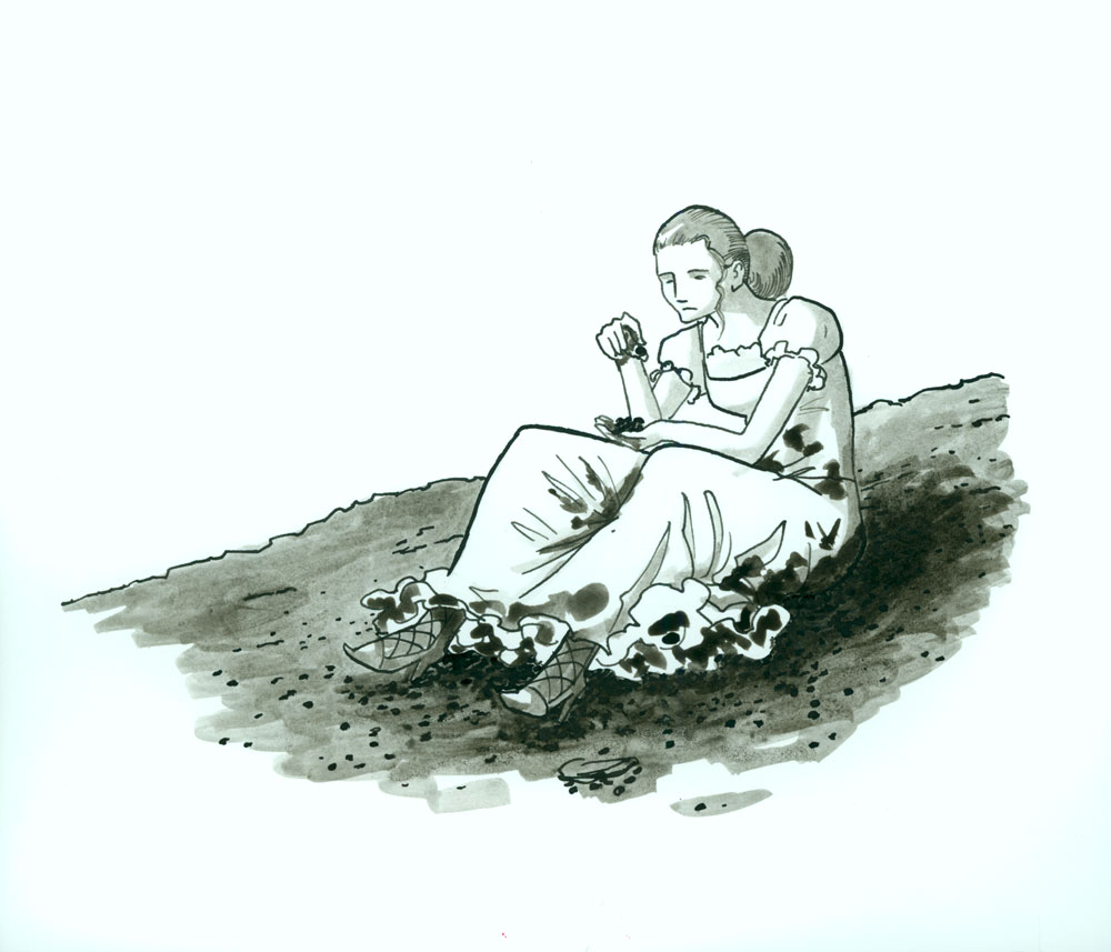 Sehr schön :thumbup: Dass sie sich vollkleckert habe ich mitgekriegt, aber was macht sie da? Ich kann das nur schwer erkennen :S Isst sie Beeren oder Pizza? Ansonsten super, wie du mit Grautönen arbeitest! (Wasserfarbe, Copics, Aquarell?) :)