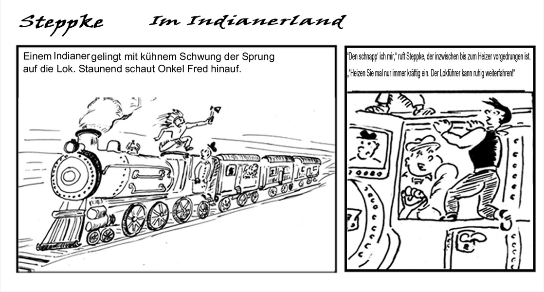 Ich tue mich übrigens mit "Steppke im Indianerland" auch etwas schwer. Das ist sehr aus dem Zusammenhang gerissen. Gibt's da eine Story, in die die Episode reingehört? Der Strip steht etwas zwischen Comic und Illustration; man kann ihn sich eigentlich nur im Zusammenhang mit einer längeren Story vorstellen.