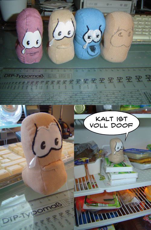 Das Stoffwürmchen steht kurz vor "Serienproduktion". Klee hat ja den Prototypen genäht und meine Mama ist Hobby Puppendoktorin und näht Teddys und solch Zeugs (aber nur des Nachts - tagsüber ist sie normale technische Zeichnerin)