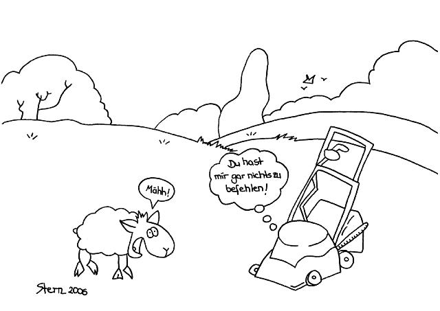 @ Stern: Sehr schöner Gag, aber der Mäher sollte keine Gesichtszüge haben und seinen Text nur denken, statt ihn zu sagen - fände ich viel passender :)