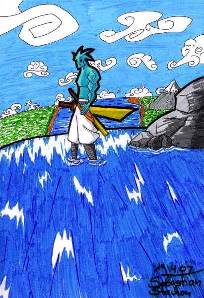 Coole wolken XD und schöne muskeln, leider merkt man schnell das die Perspektive nicht stimmt. Der fluss im HG bräuche ne viel stärkere verkürzung.