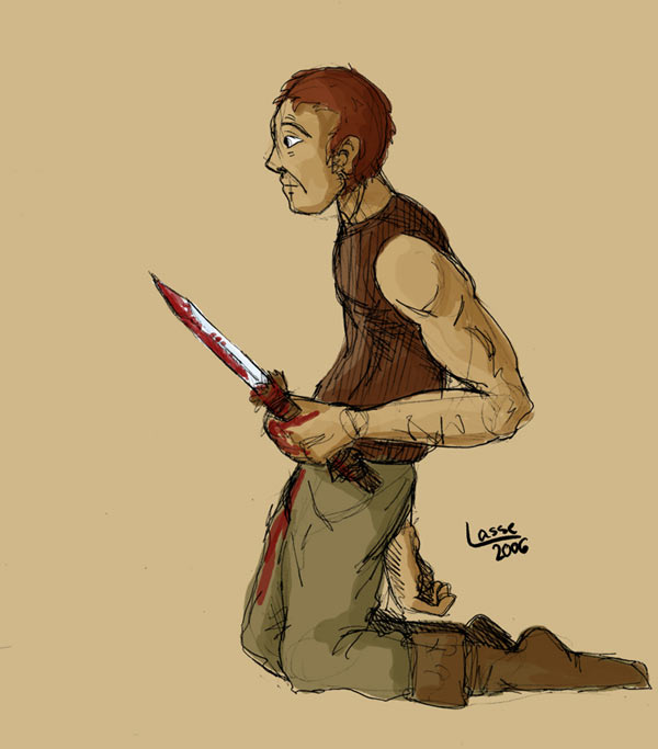 nehm an nicht sein blut sondern er hat grade wen umgebracht und kniet jetz so in richtung *oh mein gott washabe ich getan, neeeeeeeein*![]()