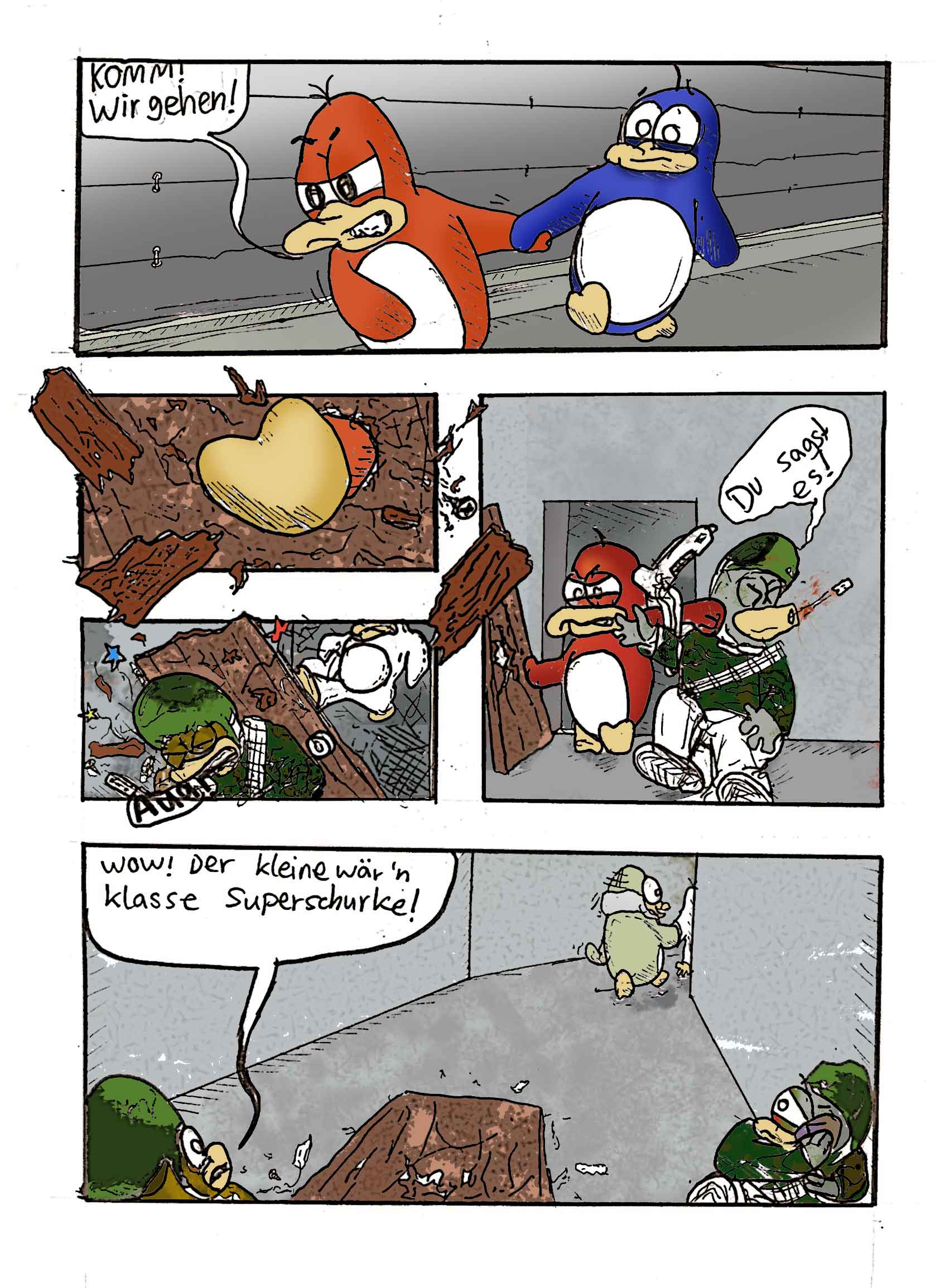 Story technisch habe ich mir nur den groben Handlungsablauf vorgegeben, weil ich wenn ich alles bis ins letzte Detail geplant habe schon 15 seiten weiterdenke und dann keine Lust mehr aufs zeichnen der vorherigen Seiten habe. Und wenn doch, sieht es aus wie (was dann ja der Fall ist) wenn ein Geistesabwesender das ganze zu Papier gebracht hätte. Wenn das ganze zu durchdacht ist habe ich also keine Lust mehr. Deshalb zeichne ich eigentlich immer ziemlich spontan, und wenn ein Witz oder eine Zeichnung nicht so gut aussieht oder funktioniert, wie ich es mir beim zeichnen dachte, überklebe ich ihn oder sie einfach und setze die Handlung anders fort.