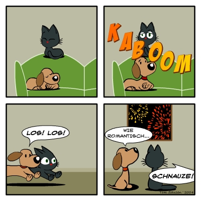 Ich finde das "Wie romantisch" irgendwie besser. Da kommt mir Eika (Hund?;)) nämlich so vor wie ein Weichei und Hannibal wie der "Boss". Und das hat mir gefallen, eine Katze, die dem Hund sagt, wo es lang geht. Gut, sie sagt ja jetz immernoch "Schnauze", aber der Hund ist für mich nichtmehr ein Weichei..