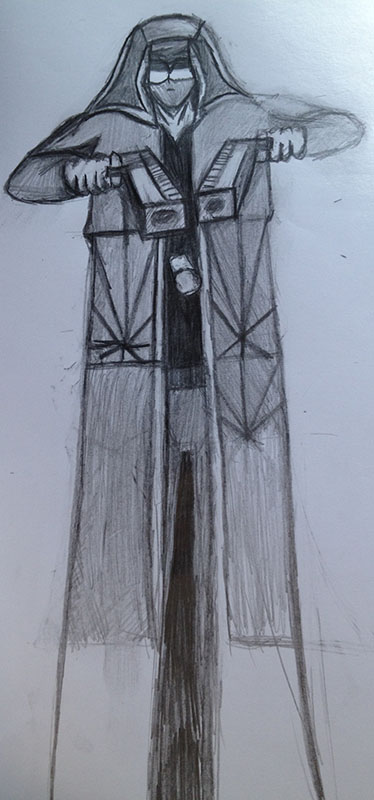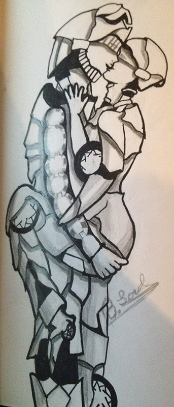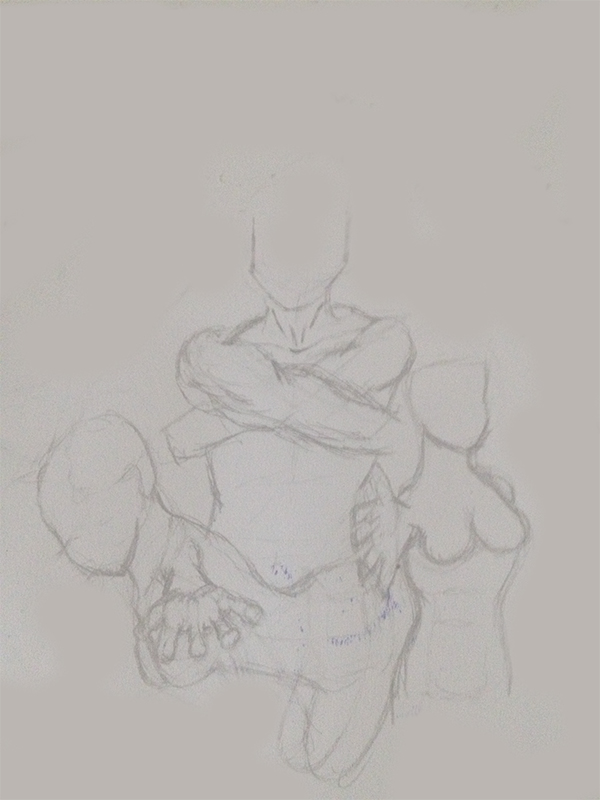 Das neue Bild ist für mich schon allein wegen der sehr energischen Strichführung und -stärke interessant anzusehen. Die Metallpartien der Rüstungen (oder Körper?) sind durch die Bleistiftschraffur auch als solche zu erkennen, nur wirken sie durch diese ungleichmäßigen Outlines etwas organisch, wie Laub oder so. Jedenfalls nicht so starr wie eine Rüstung, die aus genau gleichen, linearen Teilen besteht. Ist ein Aspekt, zu dem man sich alles mögliche denken kann, wenn man ihn nicht gleich als "Fehler" sieht, zum Beispiel eben, dass die Leute eher Metall sind, als es anzuhaben.