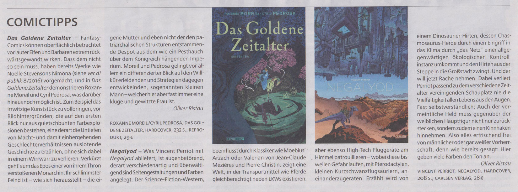 In der Gewerkschaftszeitung ver.di publik 4/2019 gibt's zwei Comictipps: "Das Goldene Zeitalter" (Reprodukt) von Roxanne Moreil und Cyril Pedrosa und "Negalyod" (Carlsen) von Vincent Perriot. Und Melodie & Rhythmus / 3. Quartal 2019, das "Magazin für Gegenkultur", bringt auf 6 Seiten Zeichnungen von und ein Interview mit dem US-amerikanischen Zeichner Eli Valley, außerdem eine Rezension zu "Der letzte Weg" (bahoe books) von Thomas Fatzinek.