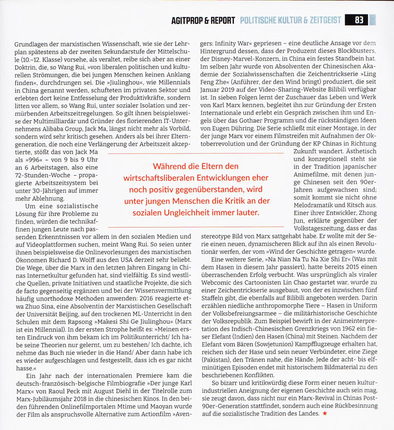 Beide Beiträge sind aus: Melodie & Rhythmus - Magazin für Gegenkultur, 2. Quartal 2021. Der zweite dreht sich zwar nicht speziell um Comics, streift aber zumindest zwei chinesische Zeichentrickserien: "Ling Feng Zhe" (Anführer, der den Wind bringt) und "Na Nian Na Tu Na Xie Shi Er" (Was mit dem Hasen in diesem Jahr passiert), die auf einem Webcomic des Cartoonisten Lin Chao basiert.