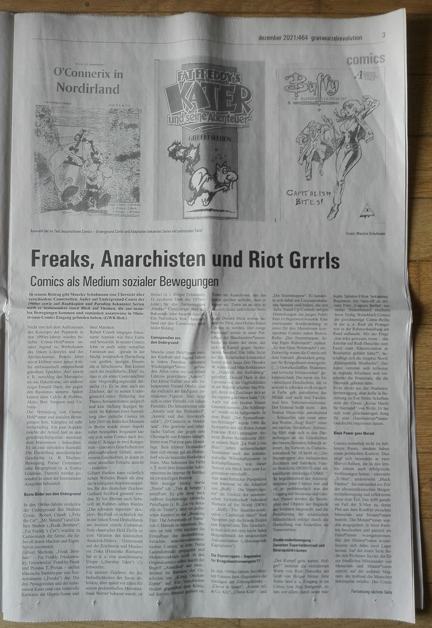 Die Dezemberausgabe der "Graswurzelrevolution" hat einen Comic-Schwerpunkt und kündigt an, ab Anfang 2022 werde es eine Kolumne rund um Bildergeschichten, Comics, Graphic Novels und Mangas geben. Habe die Seiten mal abfotografiert. Sorry wg. der bescheidenen Bildqualität. Die Seite mit dem kurzen Interview zum Comic-Programm des Unrast-Verlags habe ich dabei leider übersehen. Aber auf dessen Website findet ihr ja alle Titel.
