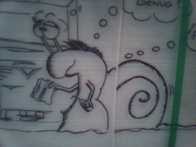 in den Denkblasen der Schnecke standen nur so Sachen wie "Schnell Genug ??) und (Putzen...putzen...putzen..)...aber denn Sinn darin verstehen halt nur die Arbeitskollegen :D :D