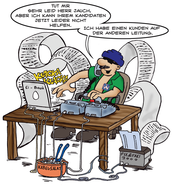 hier noch eins von der Sorte: "Ach ja, Stephan wenn Du das Banner fertig hast, kannst Du noch den Flyer machen und zwischendurch einen "Willi beim Kontakten" zeichnen. ;)"