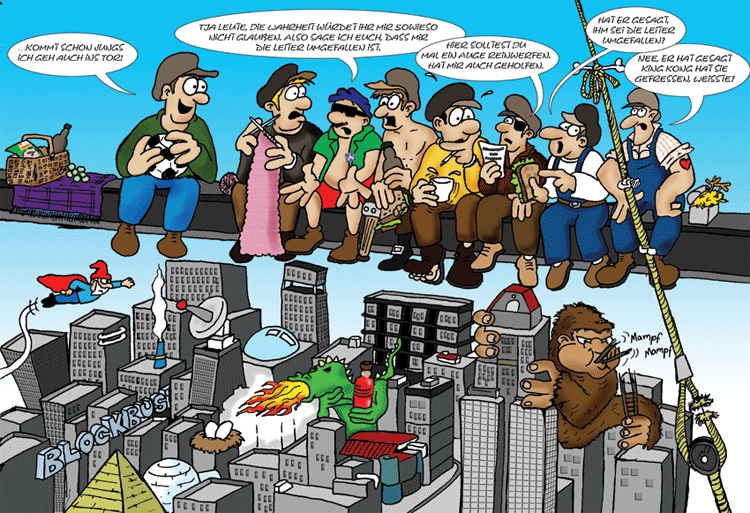 Das bild ist eine Parodie auf: "Lunch atop a Skyscraper" von Levis Hine (Eigentlich ein Foto - Kennt bestimmt jeder. Da wo die halt alle auf dem Stahlträger sitzen und Mampfen :D)
