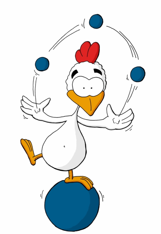 ein freund hat sich ein huhn als maskottchen gewünscht, es sollte seine lieblingshobbies ausführen: