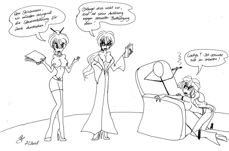 Um hier die Wartezeit ein wenig zu überbrücken und da der Strichmann ja mehr Cartoons mit Babsi, unserer findigen Oben-ohne-Steuerberaterin forderte, gibt es hier mein offizielles Strichmann-FanArt.