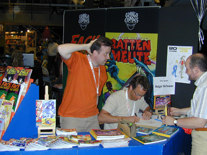 Mal jemand ganz anderes: Holger Bommer musste auch mal auf ein Foto drauf. Warum? Weil er dauernd freundlich ist, Comics mit dem Titel "Fack die Henne" zeichnet (ganz links im Bild) und mit "Holgi" unterschreibt. Wenn das keine guten Gründe sind ;)
