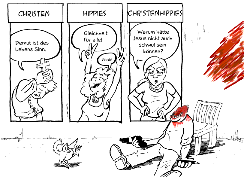 Ich rede aber eher von diesen nicht aushaltbaren modernen Hippies und Christen in unserem Alter. Und die laufen nicht unbedingt mit Jutehemd und Bibel unterm Arm durch die Gegend, sondern sind versteckter. Ich meine diese unzuverlässigen, faulen, konsumierenden, nach allen Regeln angepassten und körperlich und geistig passivsten Wohlstandskinder, die einem tagtäglich nur noch die Eier rasieren. In München ist das (meiner Erfahrung nach) besonders krass. Das Schlimmste ist aber: Man gehört selber dazu und merkt es nicht. Aber kein Mensch wird auf einmal alltagsphilosohisch.
