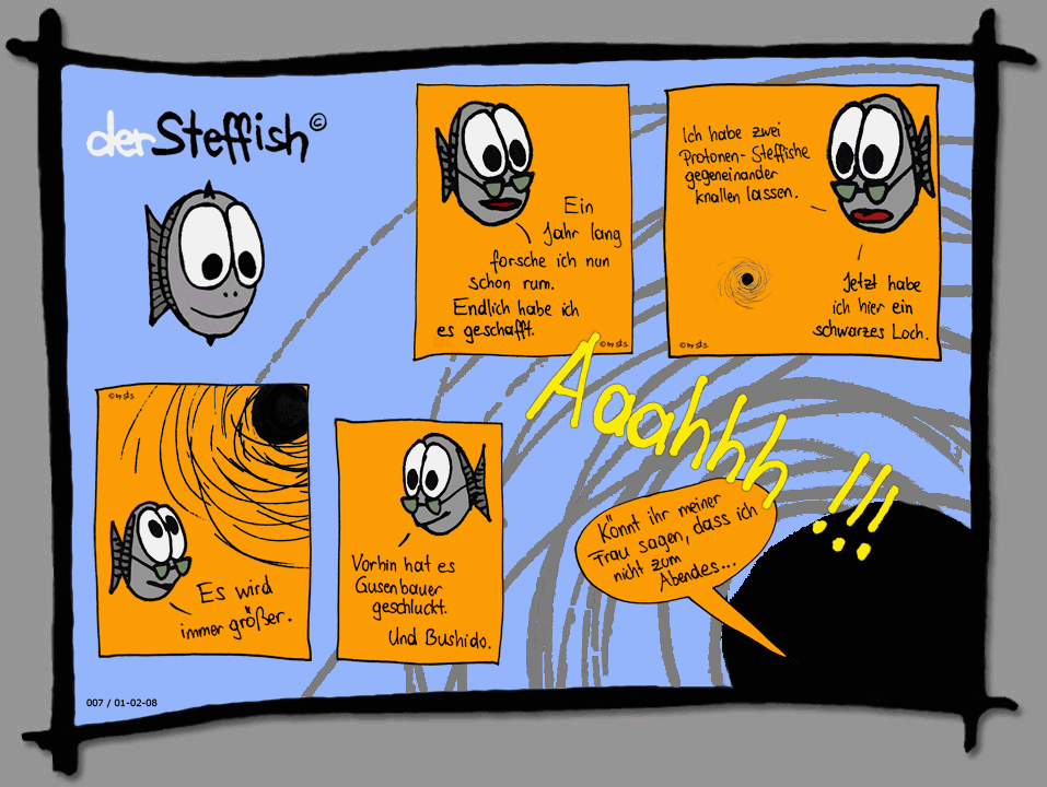 Hehe, nicht schlecht. Der Professor muss ziemlich lässig drauf sein, seinem "Ich forsch hier schon 'ne Zeit lang rum" nach und dass das schwarze Loch ausgerechnet Gusenbauer und Bushido schluckt ist nah an der Grenze zum Kellerkind-Humor :D Allerdings bilden sich bei dir die klassischen weißen Pixelränder (zum Beispiel wo das schwarze Loch den Panelrand schneidet); es wäre schöner, du würdest die entweder nachträglich wegpinseln oder gleich, wenn du einen Bereich mit dem Zauberstab auswählst und - je nach dem, welches Grafikprogramm du benutzt - den Auswahlbereich erweiterst und dann erst mit Farbe füllst.