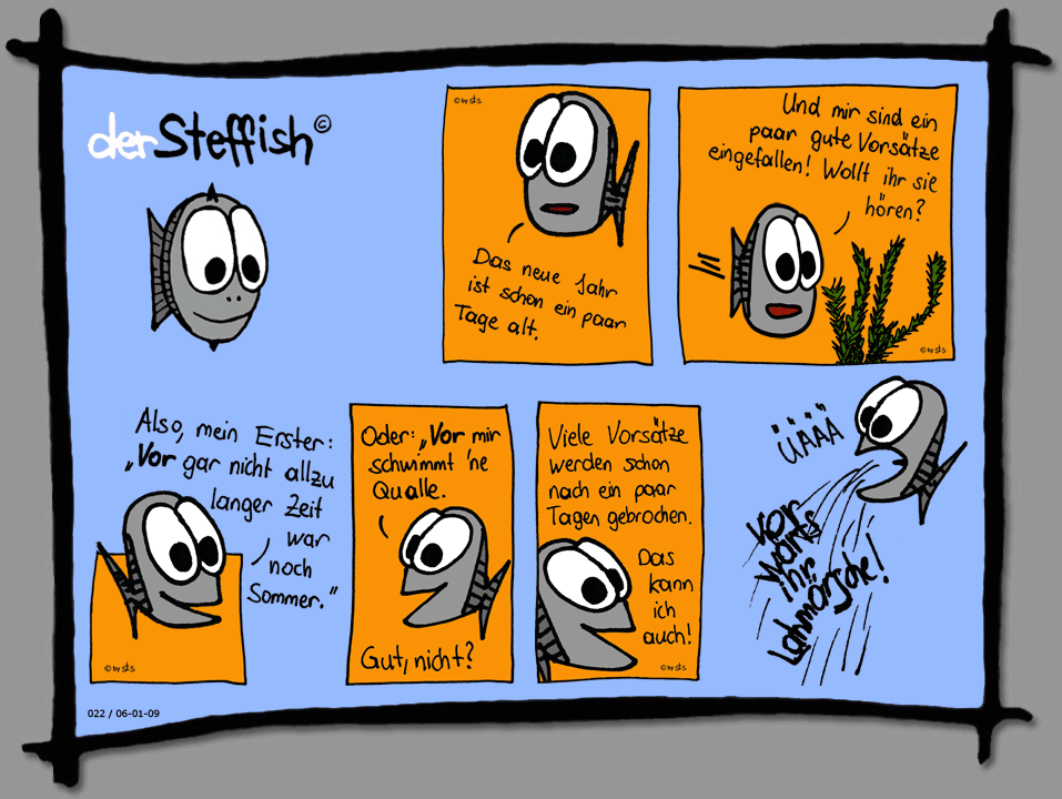 Ich persönlich würde mich freuen, wenn die Gags ein wenig fisch-/ bzw. teichspezifischer wären. So nach dem Motto: Was für Neujahrsvorsätze könnte ein Fisch haben? Wie ist das mit dem Bleigießen unter Wasser? Feuer/Hitze?