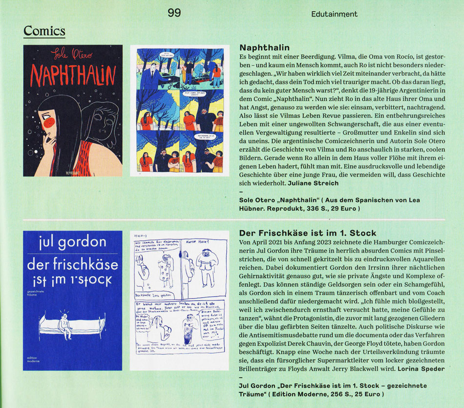 In an.schläge - DAS FEMINISTISCHE MAGAZIN VI/2023 stellt Naomi Lobnig unter dem Titel "Krankheit zeichnen" - Untertitel: "Graphic Medicine verarbeitet Krankheit und Schmerz künstlerisch und bricht mit Stereotypen" - eine Auswahl vor. Die Comics sind: