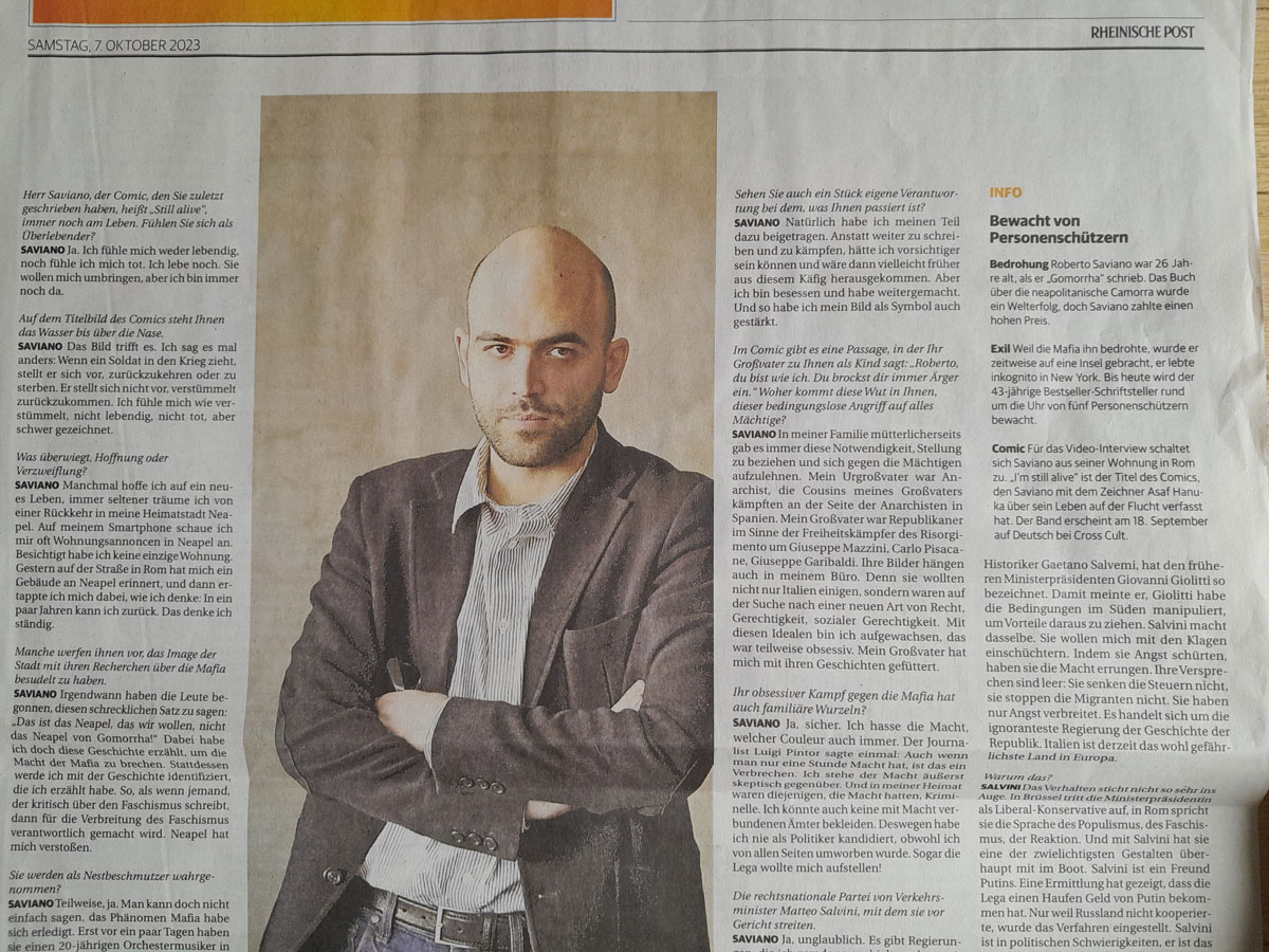 Interview mit Roberto Saviano, offenbar anlässlich des Comics "I'm still alive" (auf Deutsch im Verlag Cross Cult), den er gemeinsam mit dem Zeichner Asaf Hanuka gemacht hat.