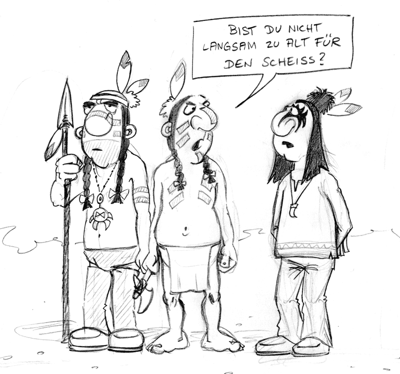 Kommt noch. Ich habe den Cartoon zwar fertig, aber er gefällt mir nicht. Sowas sieht man leider immer erst, wenn er fertig ist. Für den Gag ist es wichtig, dass die Tante den Kopf des Kleinen wegdreht. Leider kommt eben dieses und das Stillen viel zu undeutlich rüber, finde ich (obwohl ihr es erkannt habt... in der fertigen Zeichnung ist es aber viiiel kleiner!), deswegen werde ich den wohl oder übel noch einmal deutlicher zeichnen müssen.