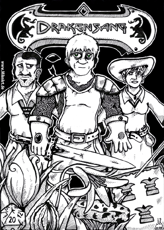 Aber wenn du konkrete Kommentare zur Umsetzung willst: Das Schwert sieht nicht scharf aus, eher wie ein Holzprügel. Dünnere Linien und sparsamere Schatten könnten hier der Trick sein. Und ist das richtig, dass die drei so steif wirken?