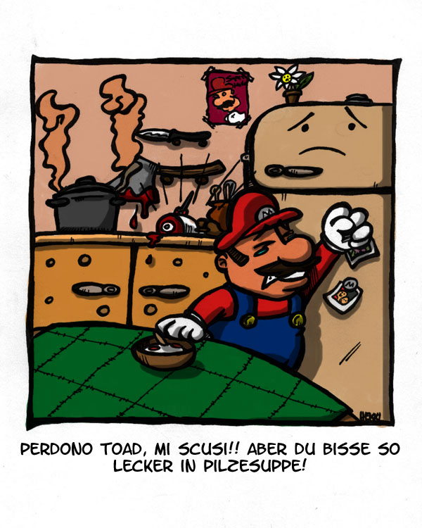 Der Mario-Cartoon ist toll, besonders der Kühlschrank :D. Übrigens sehen deine Zeichnungen grundverschieden aus, soll das so sein?