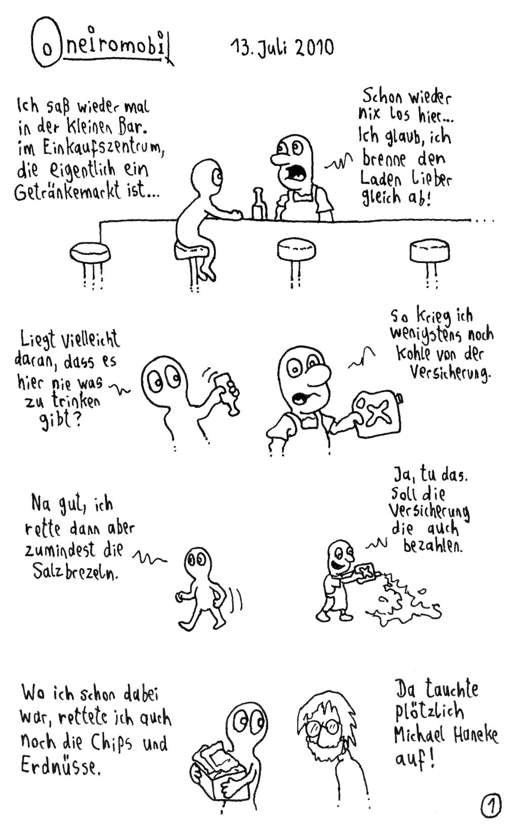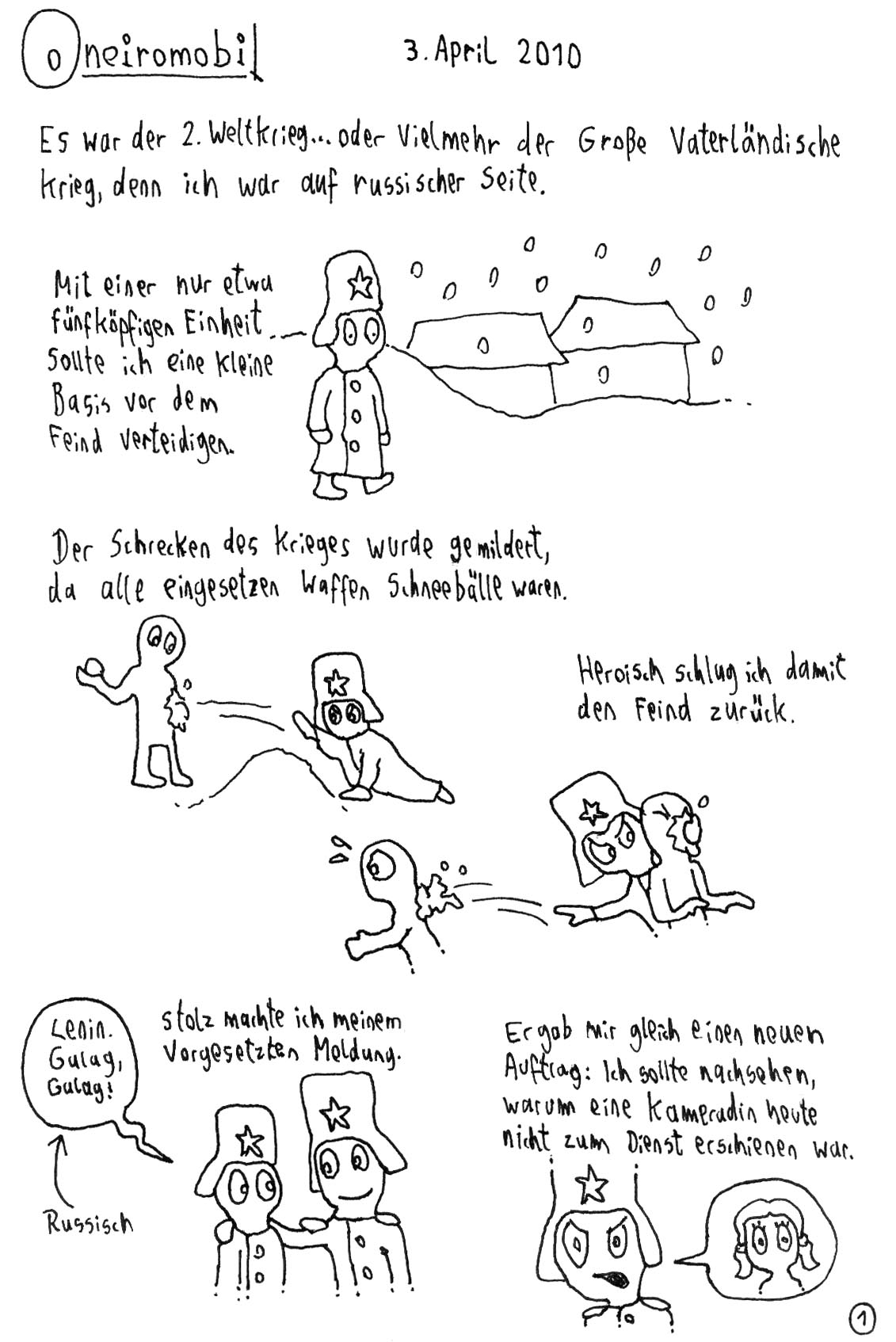 Lustige Szenen, aber sie ergeben zusammen nicht so den Über-Sinn wie in deinen anderen Traumcomics. Außerdem beschränkt sich das gesellschaftskritische Moment nur auf eine sinnlose Anspielung auf den zweiten Weltkrieg, was grundsätzlich lustig, aber leider viel zu kurz ist.