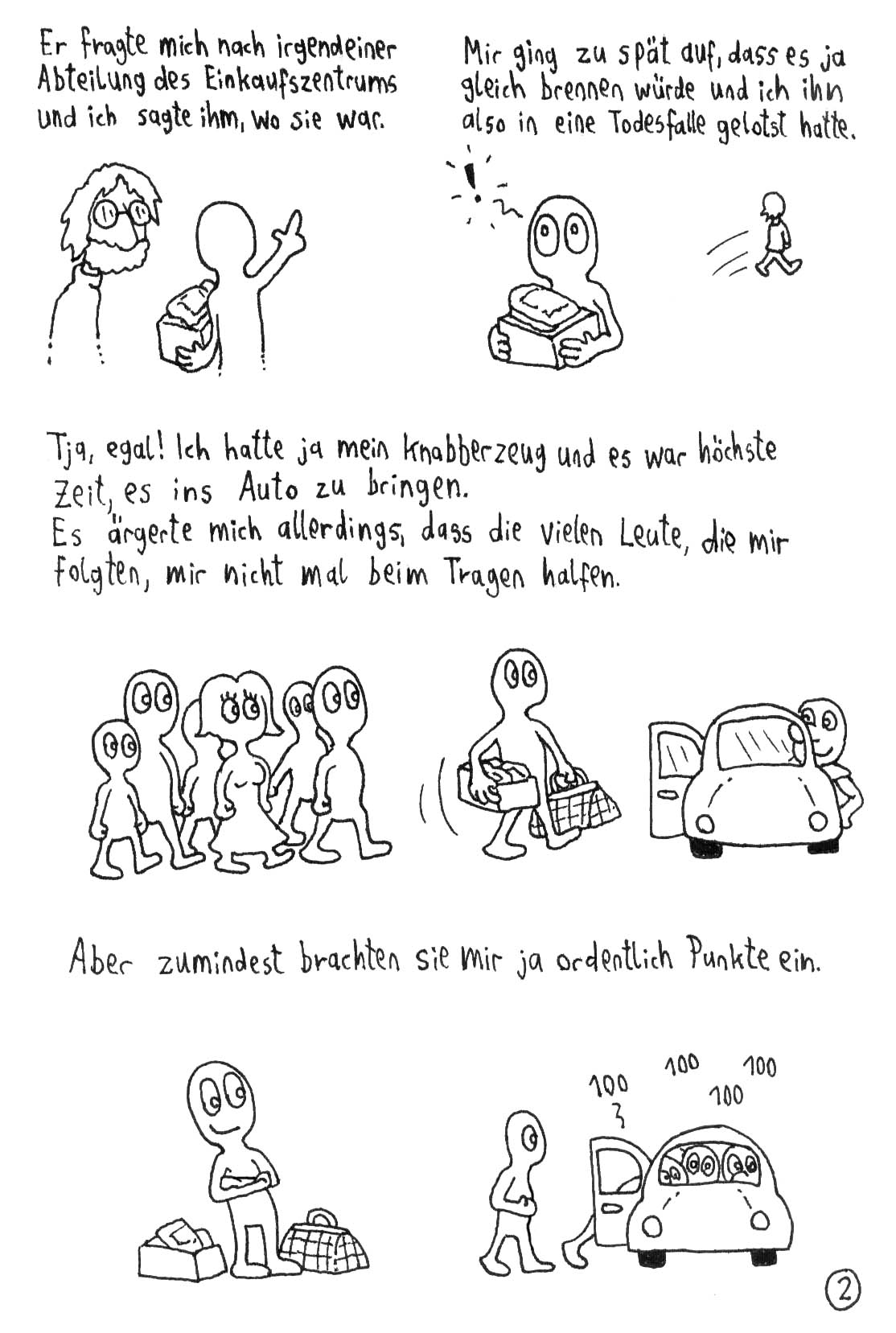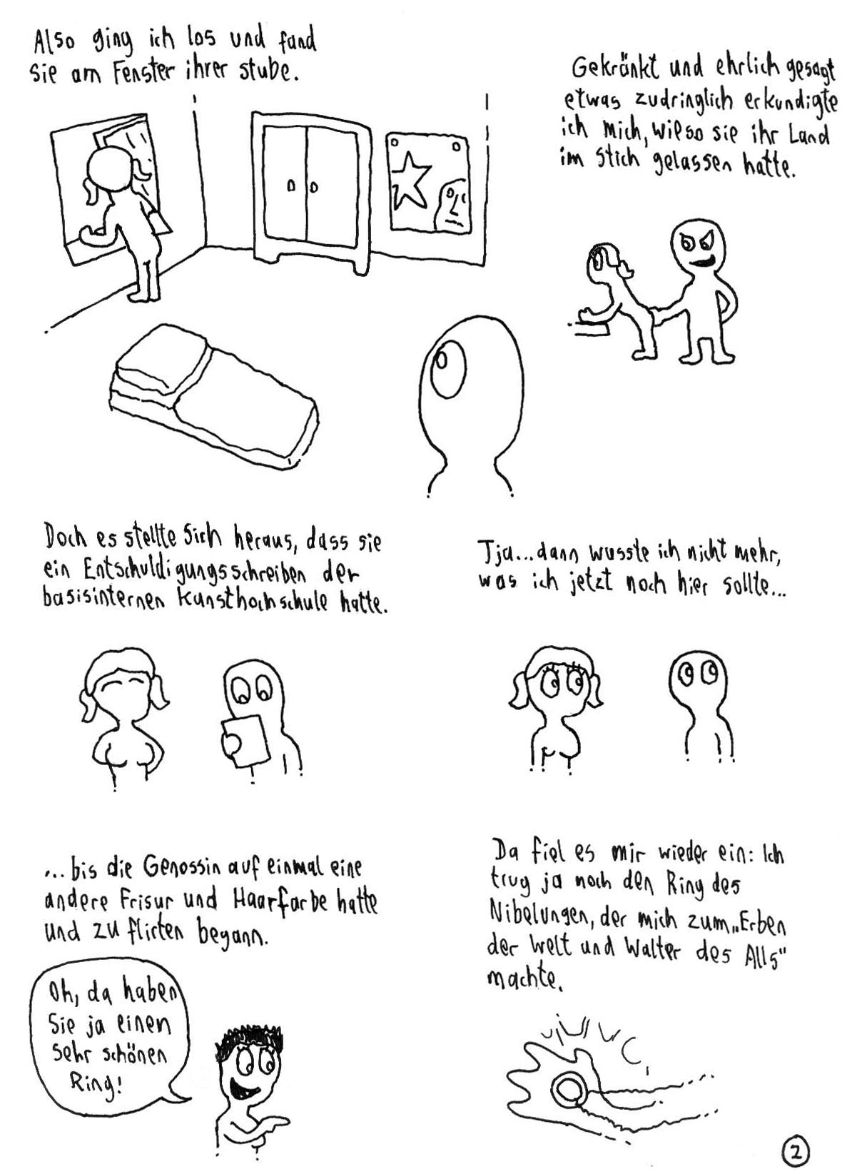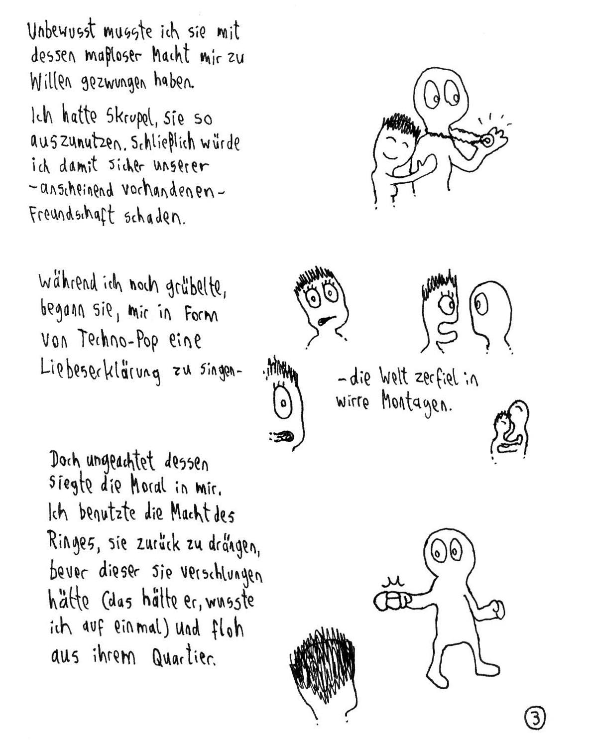 Aber ich glaube, dass es eifnach zu viel Text ist. Es ist eher eine geschriebene Geschichte mit ein paar kleinen Illustrationen am Rande als anders rum. Versuch doch einfach noch mehr mit den Bildern zu erzählen. Darauf kommt es schließlich beim Comic an. ;)