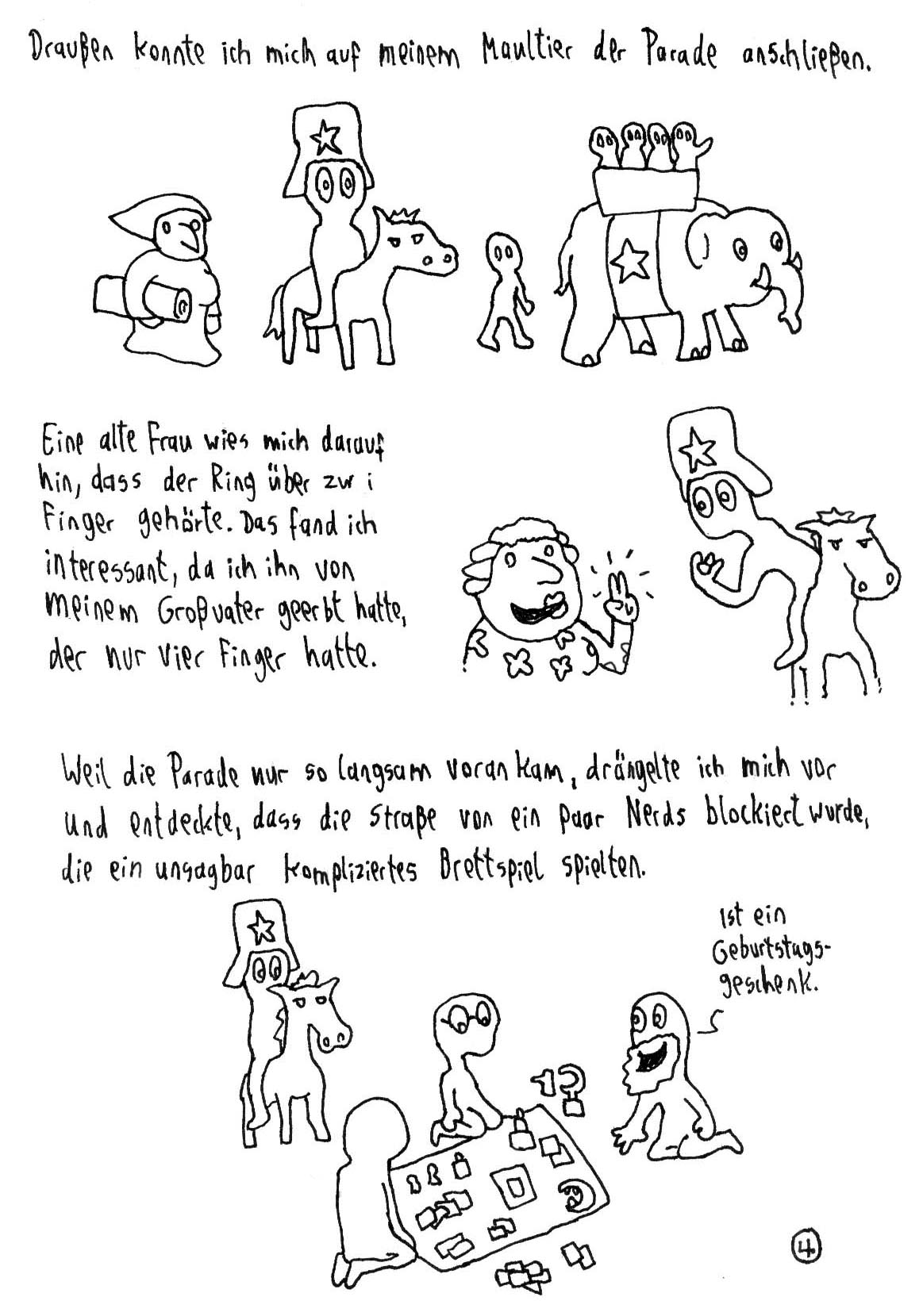 Lustige Szenen, aber sie ergeben zusammen nicht so den Über-Sinn wie in deinen anderen Traumcomics. Außerdem beschränkt sich das gesellschaftskritische Moment nur auf eine sinnlose Anspielung auf den zweiten Weltkrieg, was grundsätzlich lustig, aber leider viel zu kurz ist.