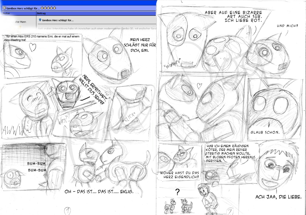 Die Idee hatte ich, beim lesen eines Thread-Titels im Aibo-Freunde-Forum unter Genibo "Genibos Herz schlägt für....", den ich auch gleich 1:1 als Überschrift für meinen Comic übernommen habe.