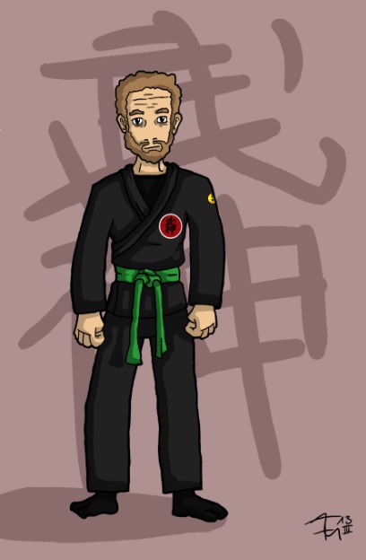 Bei dem Anzug selbst gefällt mir die Ausarbeitung nicht so. Wichtig hier: Versuche - es sei denn, du möchtest den Blick bewusst führen - überall in etwa die gleiche Detaildichte anzulegen. Das Gesicht des Trainers/Schülers (?) ... Träger des grünen Gurtes (Ha!) ... ist in dieser Zeichnung wesentlich detaillierter ausgearbeitet als die Kleidung. Zwar ist Trainingskleidung ja meist weit, aus grobem, festen Stoff und bequem geschnitten und wirft daher weniger Falten als Alltagskleidung, aber durch den Kontrast in der Detaillierung wirkt das Lineart in der Kleidung erstmal eher lieblos oder unsicher. Nähte und Falten (an den richtigen Stellen!) werten die Zeichnung meist sofort auf - es lohnt sich also, sich da ein wenig mit zu beschäftigen. Und gerade die Trainingskleidung (falls du die Zuhause hast) sollte doch ein prima Anlass sein, mal vor dem Spiegel ein wenig rumzuposen und den Faltenwurf zu untersuchen. Abschließend: Nimm das bitte nicht als Krittelei ("Is scheise!!!11einself"), sondern als Tipp - denn ich würd mir hier ehrlich gesagt nich' die Zeit vertippen, wenn ich da kein deutliches Potential sehen würde.