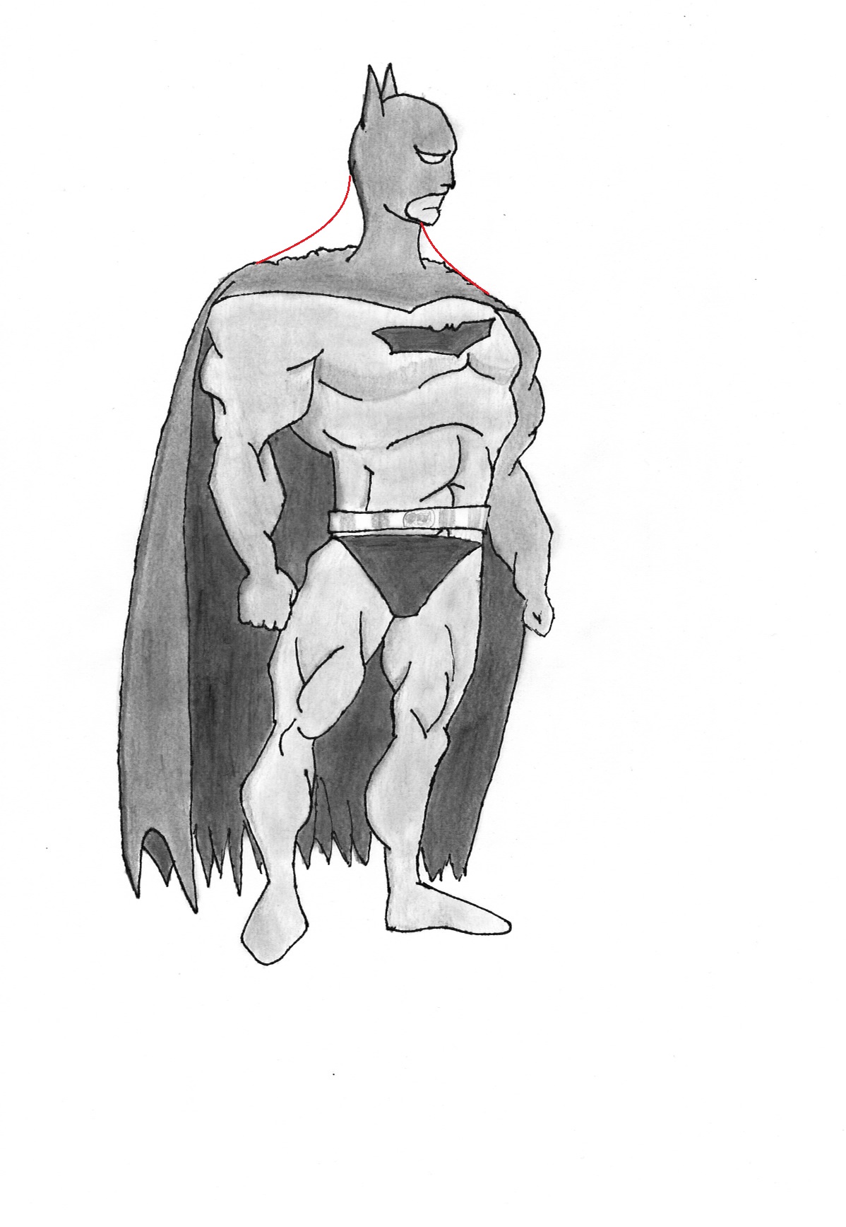 Schaut ja schonmal viiiiiel besser aus. Weiter so. Viel nach der Vorlage üben und dann auch selbst probieren. Und natürlich auch andere Posen mal ausprobieren. Ich gebe Peter aber mit dem Hals Recht. Ich hab dir mal aufgezeichnet, wie ers glaub ich auch gemeint hat. Das dieser Körperbau nicht realistisch ist, steht ja außer Frage. Und ich meine, so jemand wie Batman ist doch gerade in den Comics nie "realistisch" gezeichnet, von daher finde ich, dass das passt :)