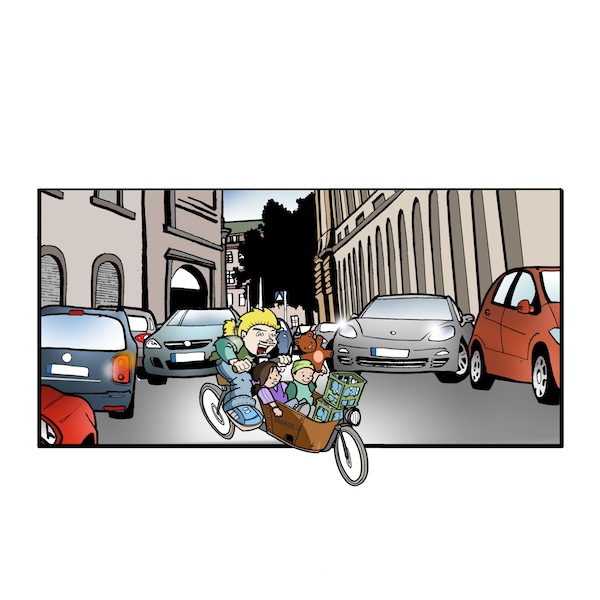 Um den Autos Bodenhaftung zu verleihen würde ich zwar schon Schatten einfügen, aber nur so wie unter dem Radfahrer, statt hell dann einfach ein bisschen dunkler.