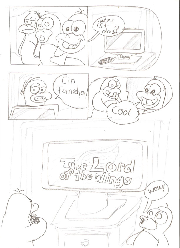 Im ersten Band, finden die pinguine eine verlassene Vorschungsbasis aus der sie alles mitnehmen, unter anderem einen Fernseher.