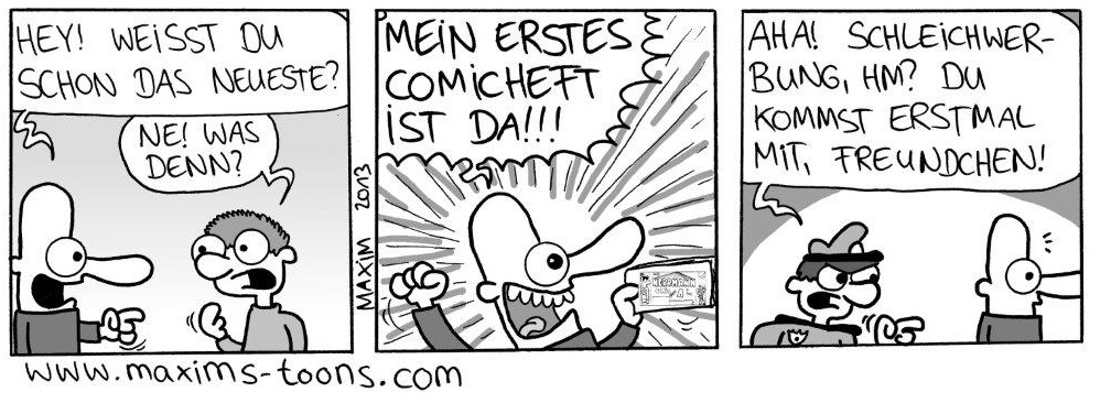 Hier der ganz frische, erst heute auf meinem nagelneuem Zeichenbrett gezeichnete und aufwändig colorierte Comicstrip! :D