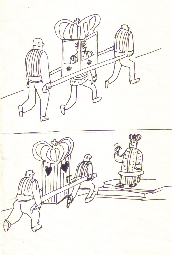 Welcome back, Arno. Ganz gute Pointe. Von der Gestaltung her hat mir der vorherige mit der Sänfte aber besser gefallen. Beim neuen sieht man wieder sehr die Bildbearbeitung. Der mit dem König kommt wesentlich lockerer rüber.