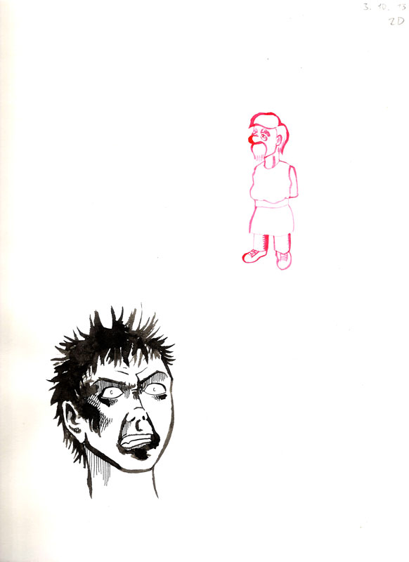 Das erste Bild stammt aus dem Skizzenbuch, ist von vor einem Jahr und nach langer Zeit der erste Versuch gewesen, mit einem Pinsel und Tusche zu zeichnen (die obere Figur in roter Tusche).