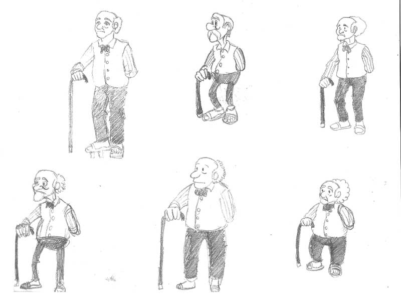 Um mal die Stilvielfaltsfrage aus einem fremden in mein Thema zu holen: Auf dieser Skizzenbuchseite habe ich ausprobiert, eine Figur durch verschiedene Stile zu jagen.