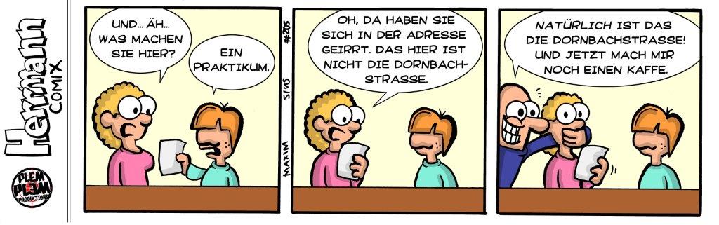 Der Gag ist richtig gut. Vom Timing her könnte mans aber noch optimieren. In nur 3 Bildern mit einer Rückblende zu arbeiten, finde ich etwas unglücklich. Man könnte es so lösen: Die Freundin schärft Hermann vor dem Gespräch ein: "Also noch mal: Bleib ganz ruhig und versau das nicht!" "Ja klar, doch. Ich bleib cool!" Und dann mit Bild 2 weiter...