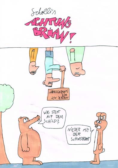 Guter Gag, der aber auch deine zeichnerische Schwäche offenlegt, du zeichnest deine Figuren nämlich fast immer aus der gleichen Perspektive. Das mag zwar auch seinen Charme haben, wirkt in dieser Bildkomposition aber eher störend. Damit es klar wird, dass Brian auf die Verdächtigen schaut, wäre es besser, wenn man ihn (schräg) von hinten sehen würde.