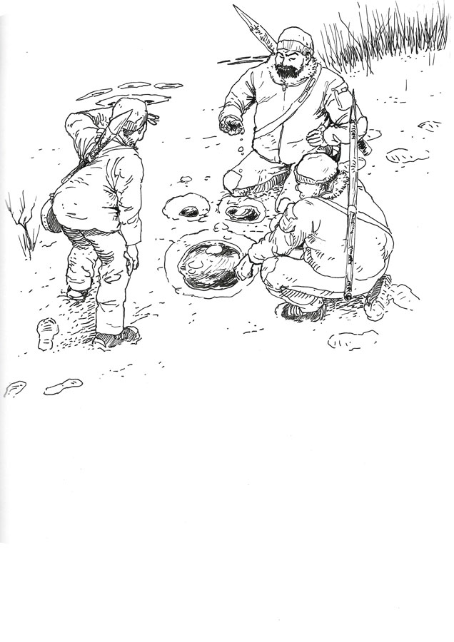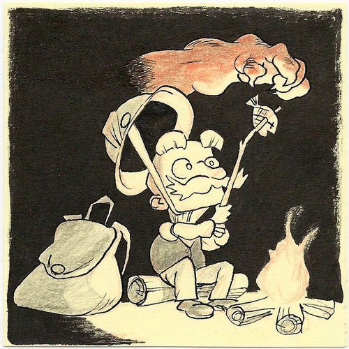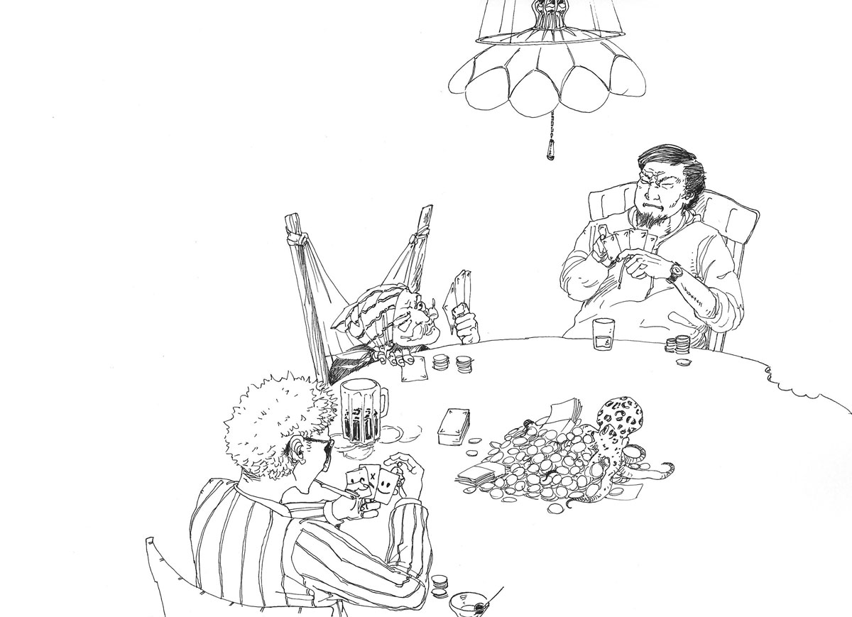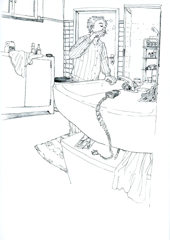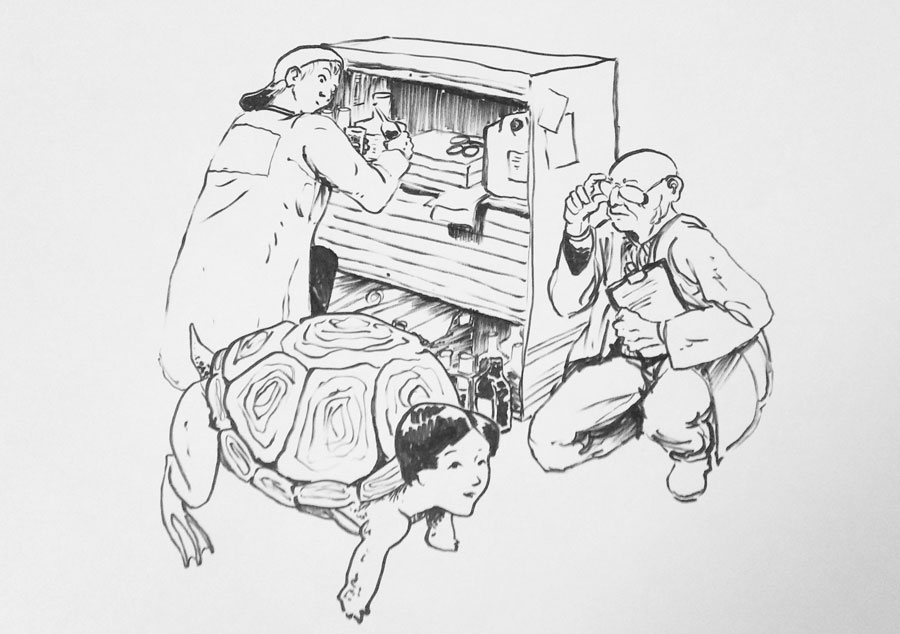 @Maxim: Ich hab drauflosgezeichnet, und dann ergab sich der Rest so Stück für Stück. Zum Beispiel von der Schildkröte zum betrachtenden Wissenschaftler, dann zum Schrank und zum Assistenten davor.