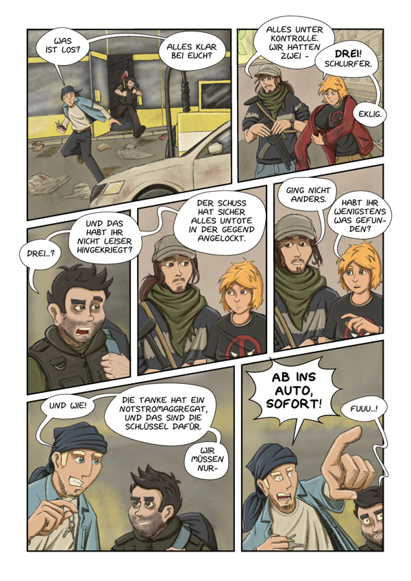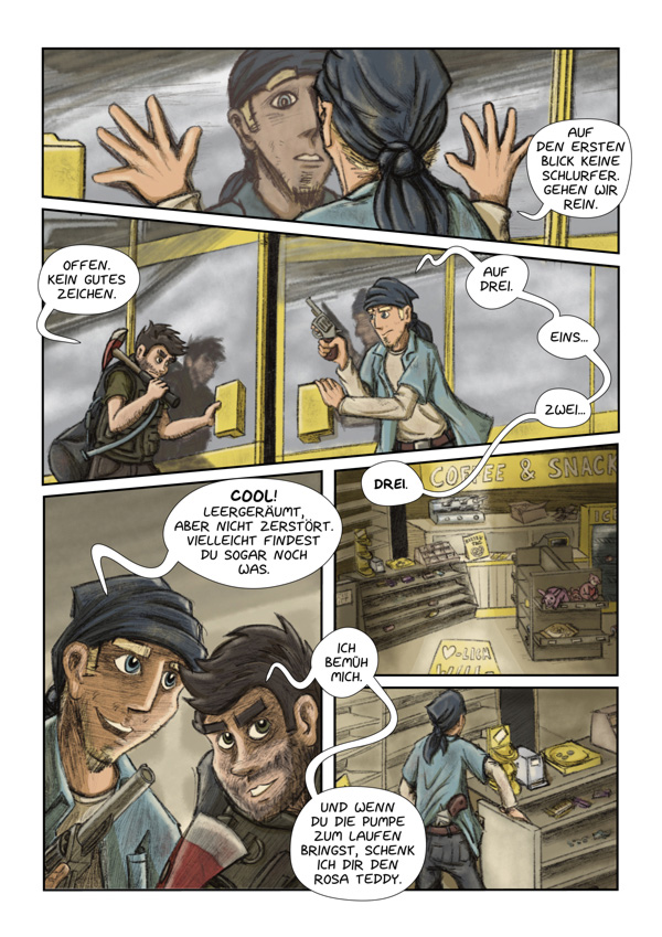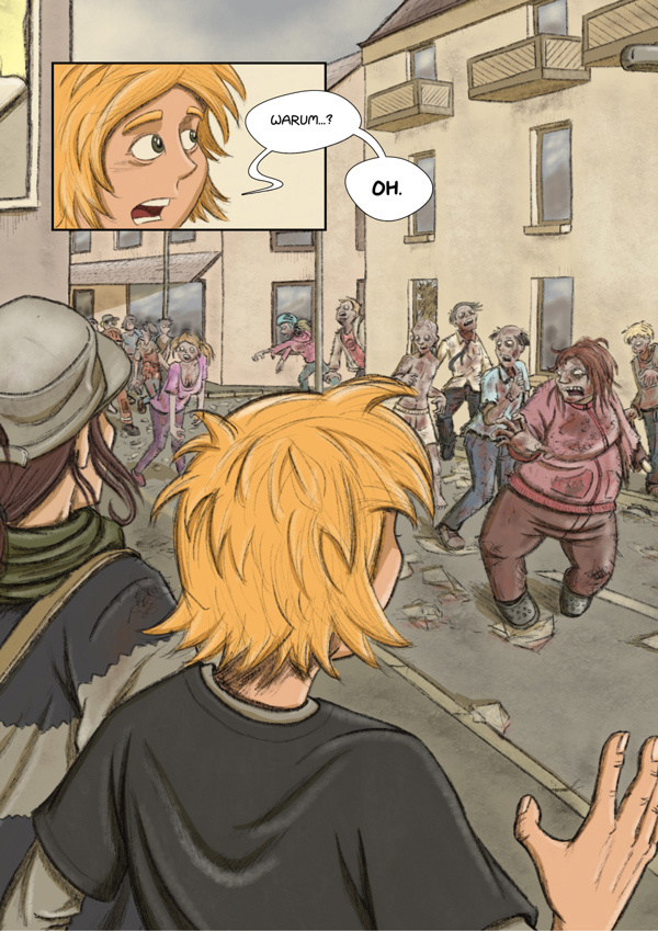 Immerhin kann ich mal wieder was zeigen. Dürfen Zombies und Gewalt und so hier überhaupt? Damit gehts nämlich auf der nächsten Seite los.