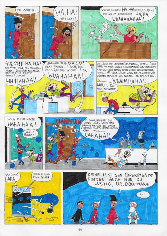 Ich gebe Kim recht, dass Seitenlayout und Soundwords sehr klassisch wirken. Spätestens bei dem "Arööh" im dritten Comic dachte ich dann an die deutsche Übersetzung von "Spirou und Fantasio"; und wenn ich mich nicht sehr irre, dann entstammt das Seitenlayout deiner Comics der Feder desselben Zeichners, nämlich Franqin, nicht wahr? Da heißt Dr. Doofmann dann aber Gaston...