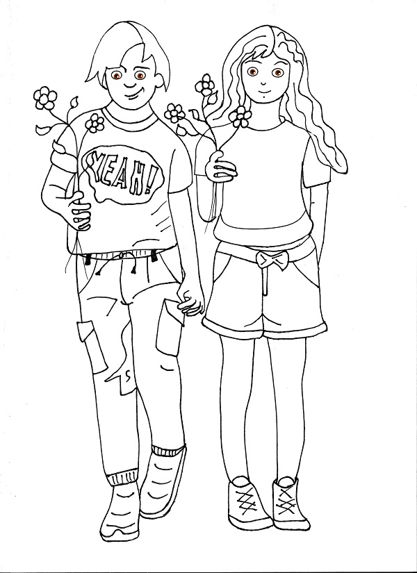 Die Körperhaltung der Kinder ist sehr ausdrucksstark. Ihr Blick ein kleines bisschen irr. :D Aber ändern würde ich die Hände, vor allem die (von den Kindern aus gesehenen) rechten. Das sind offene, keine greifenden Hände. Da müssten die Blumen eigentlich durchfallen. Und das Mädchen hat einen Oberarmstumpf mit einer davor frei schwebenden Hand.